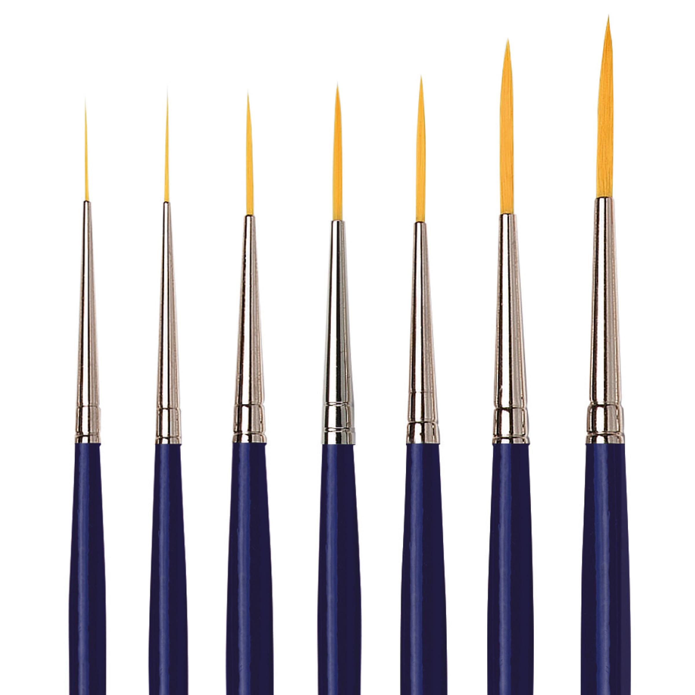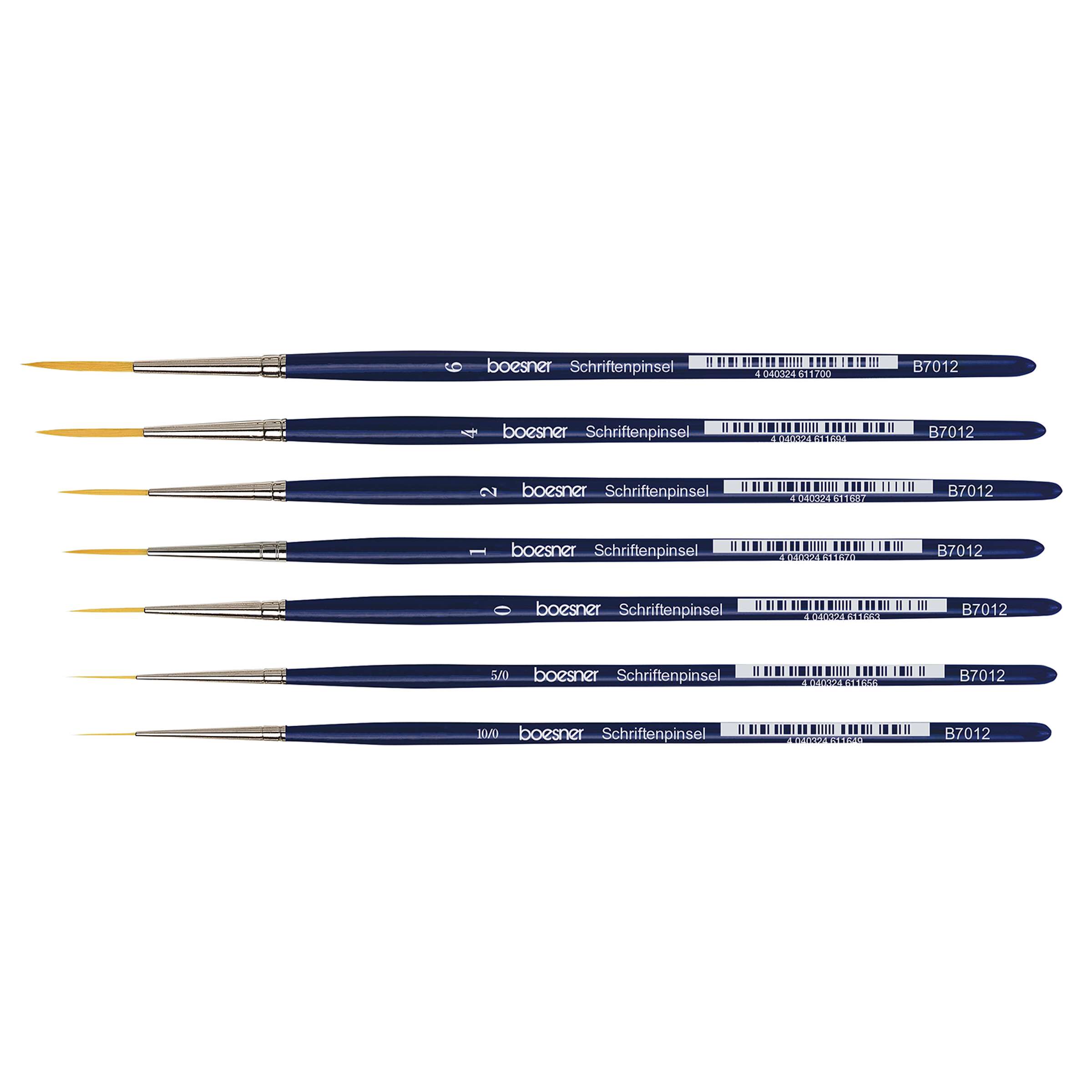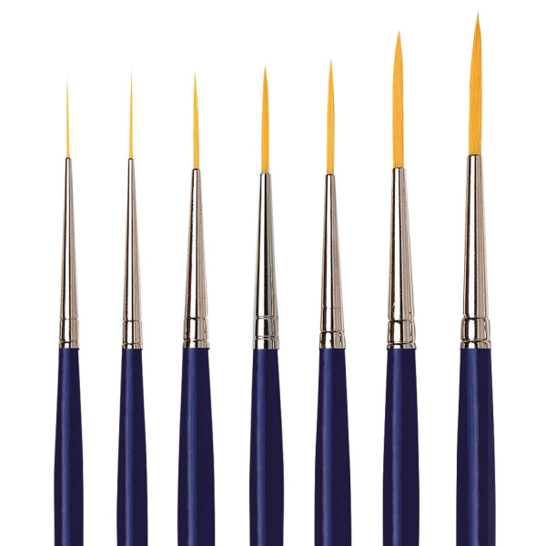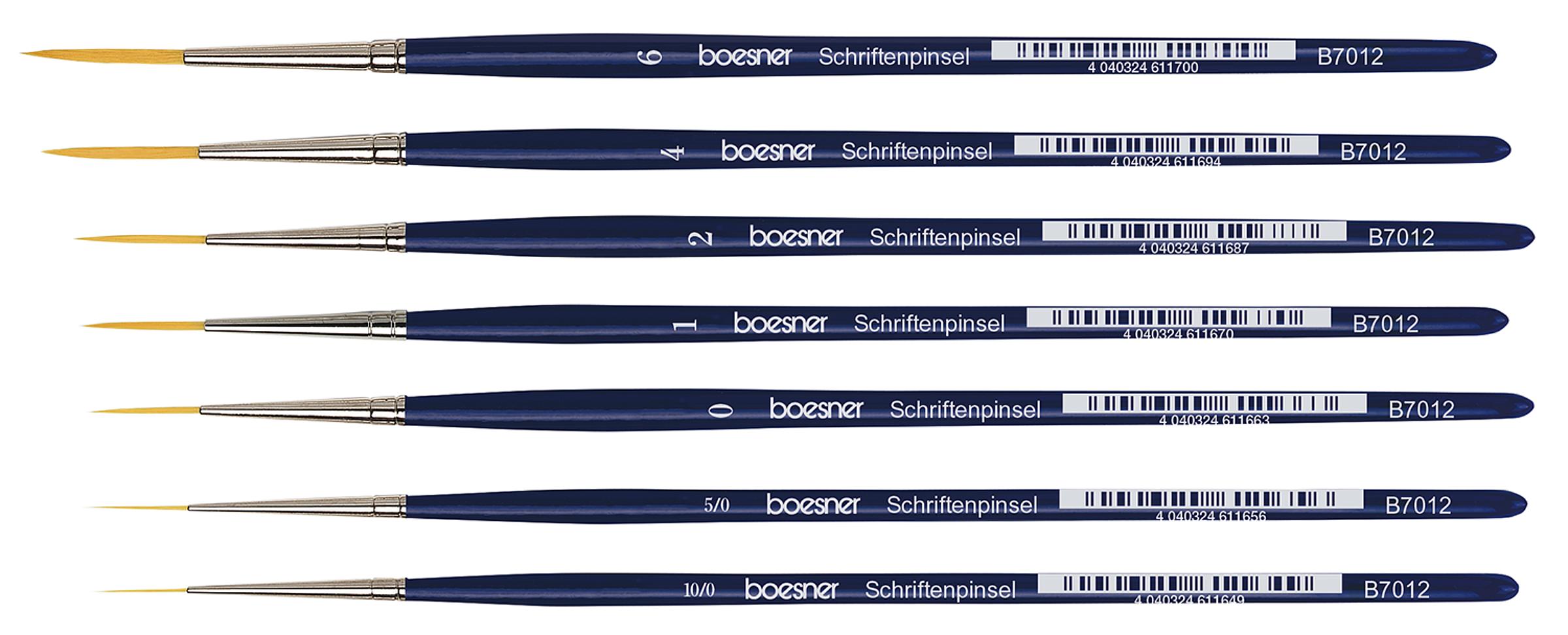 Mittellanger, spitz gebundener Schriftenpinsel zum exakten Schreiben oder Ausarbeiten gezeichneter Schriften. Der Besatz besteht aus extrafeinen, in Silberzwinge gefassten Synthetikfasern, der blau lackierte Stiel ist in Kurzform gearbeitet und liegt gut in der Hand. Vegan. Made in Germany.
