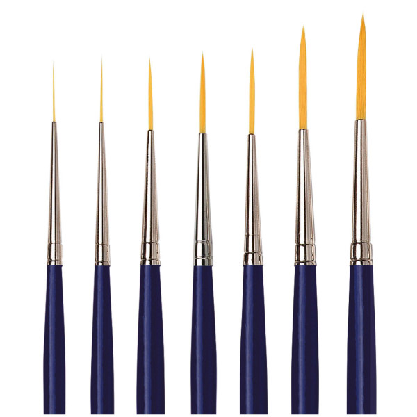 Mittellanger, spitz gebundener Schriftenpinsel zum exakten Schreiben oder Ausarbeiten gezeichneter Schriften. Der Besatz besteht aus extrafeinen, in Silberzwinge gefassten Synthetikfasern, der blau lackierte Stiel ist in Kurzform...