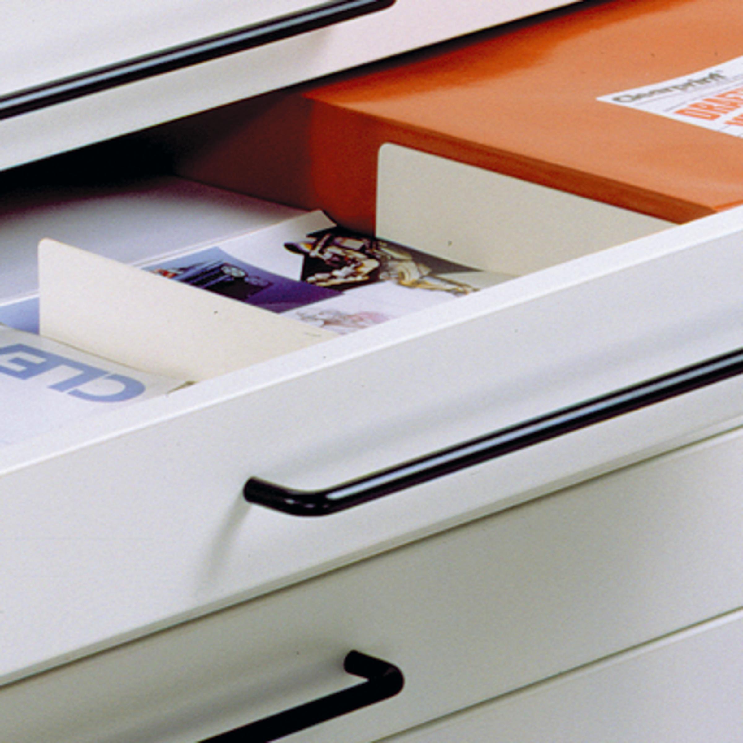 Schubfachunterteiler aus Kunststoff, weiß, Breite 18 cm, selbstklebend. Für die individuelle Einteilung der verschiedensten Papierformate. Von der Schrankgröße DIN A0 ausgehend, empfehlen wir zur Unterteilung in: 2 x DIN A1 = 2 Stück | 4 x DIN A2 = 4 Stück | 8 x DIN A3 = 10 Stück | 16 x DIN A4 = 18 Stück | 32 x DIN A5 = 34 Stück.