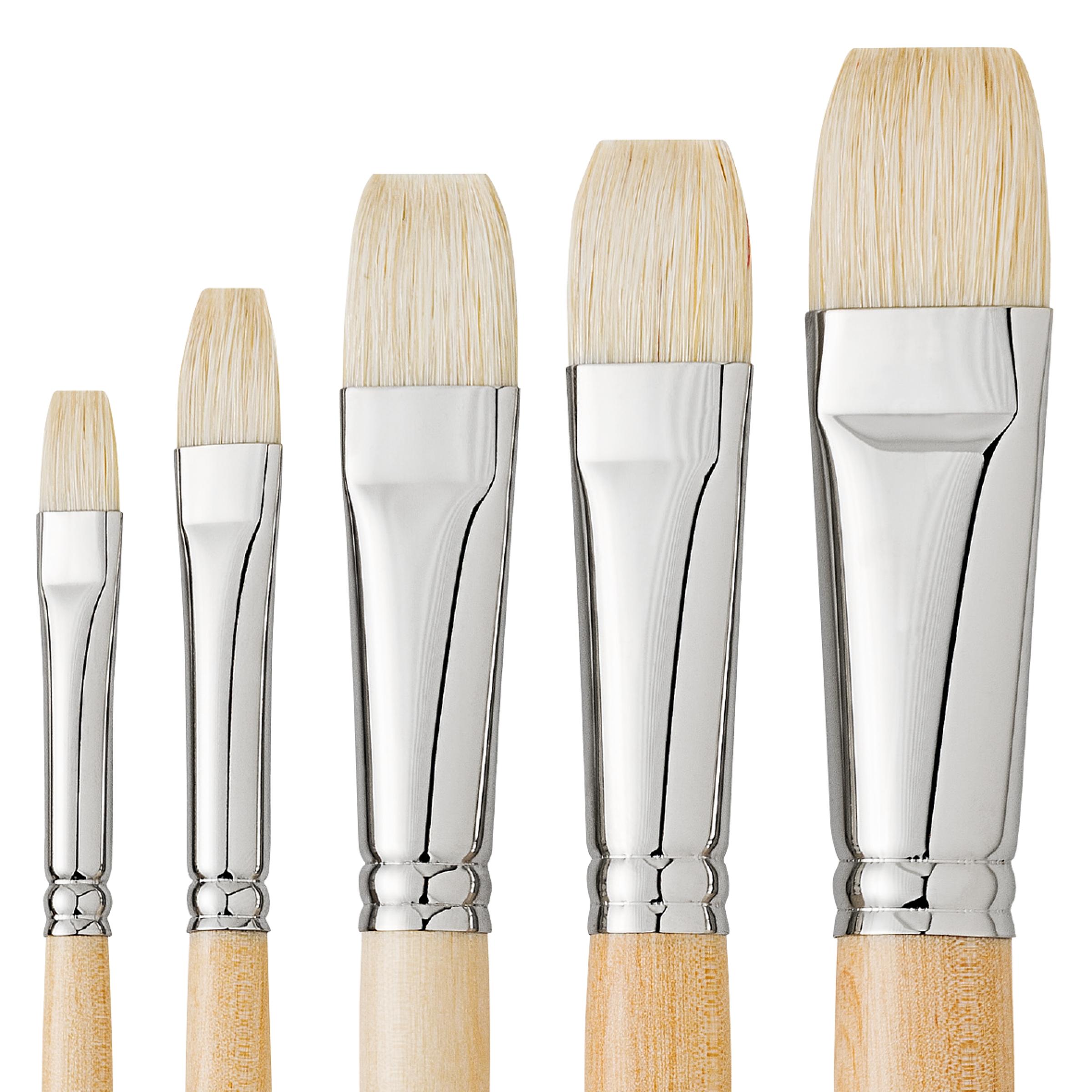 Hochwertiger Flachpinsel mit weißer, naturgekrümmter Chungking-Borste. Langer, naturlackierter Stiel, nahtlose Silberzwinge. Dieser Öl-/Acrylmalpinsel wird in aufwendiger Handarbeit auf Schluss gebunden. Dadurch behält der Pinsel selbst bei Dauergebrauch seine Form. Made in Germany.
