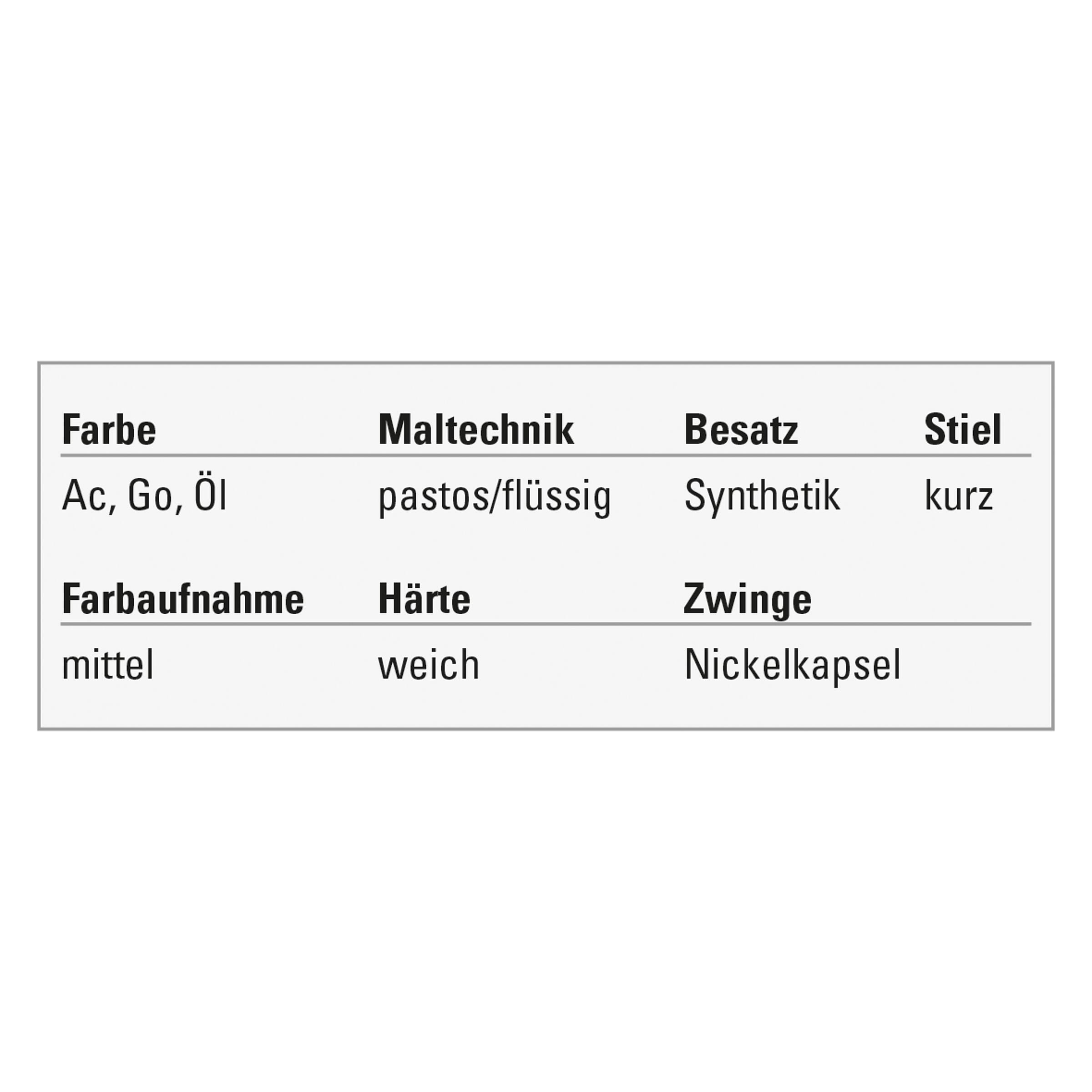 Rundpinsel aus sehr weichem, synthetischem Ziegenhaar. Die feinen, aber reißfesten Synthetikhaare sind sowohl für flüssige als auch pastose Farben verwendbar. Ausführung mit nahtloser Nickelkapsel und kurzem und naturbelassenem Pinselstiel aus Birkenholz.