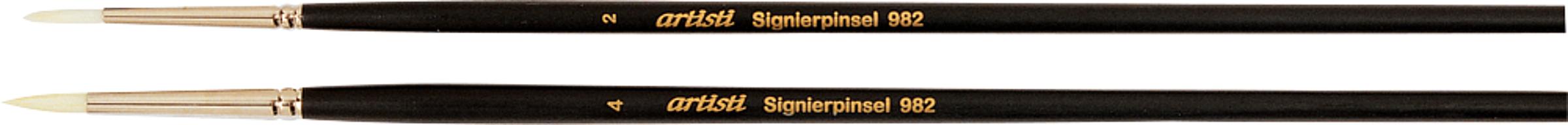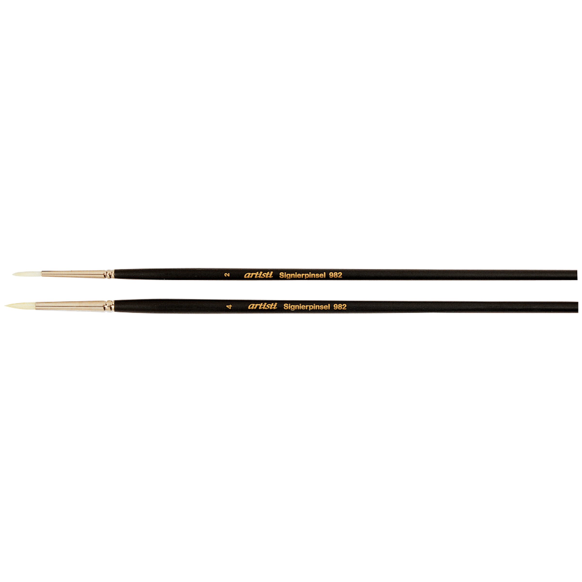 Rundpinsel mit hochwertigem Acrylon. Langer, schwarz lackierter Stiel mit nahtloser Silberzwinge. Die sehr kräftige Pinselspitze ermöglicht eine exakte Pinselführung beim Signieren mit Öl- und Acrylfarben. Made in Germany.