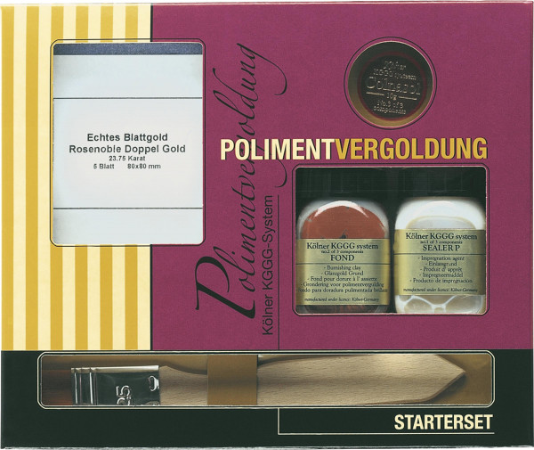 Inhalt: fünf Blatt echtes Blattgold, 23,75 Karat, lose (80 x 80 mm), 50 ml Sealer P, 50 ml Fond rot, Colnasol 10 g (Haftnetze), 1 Toray-Pinsel, Verarbeitungsanleitung.