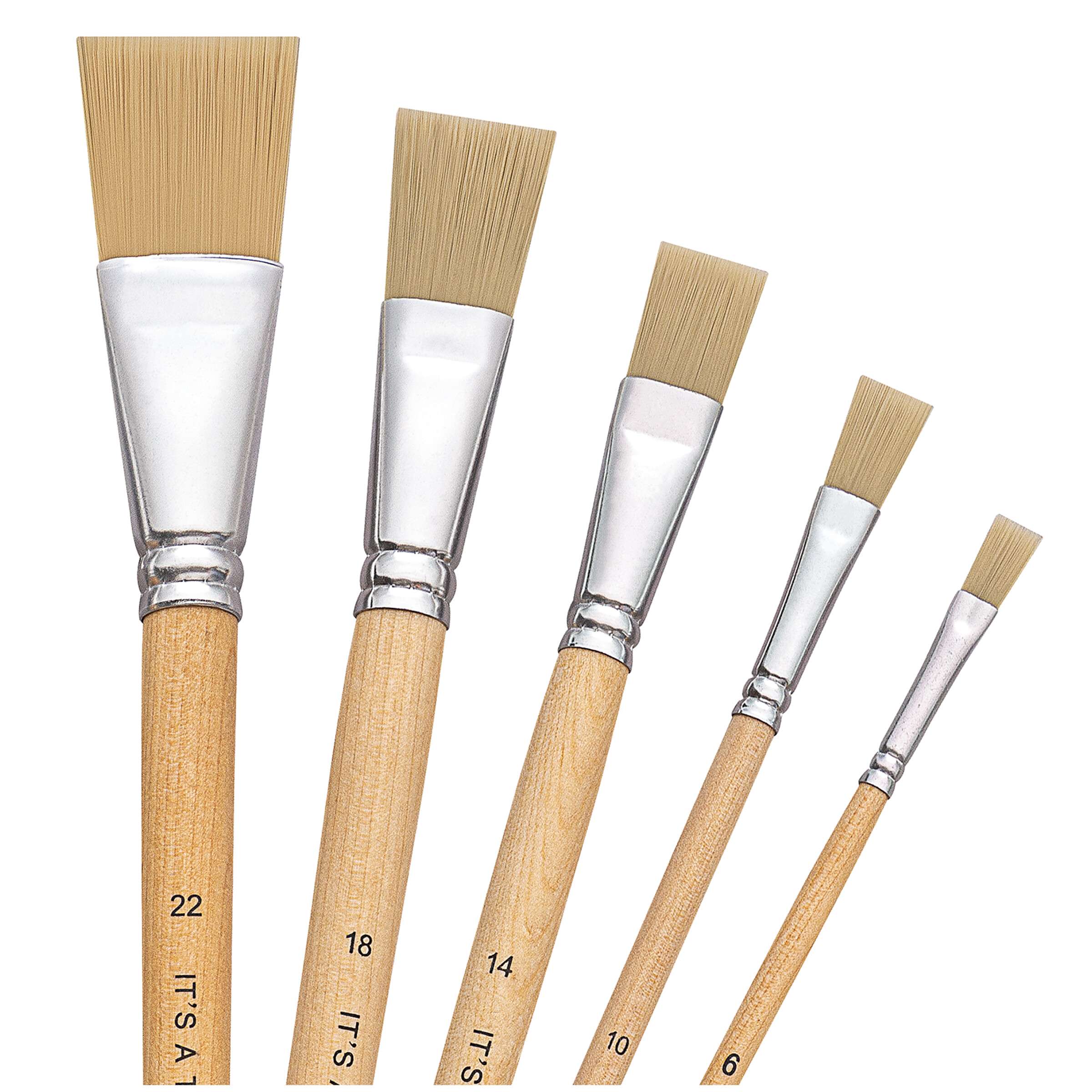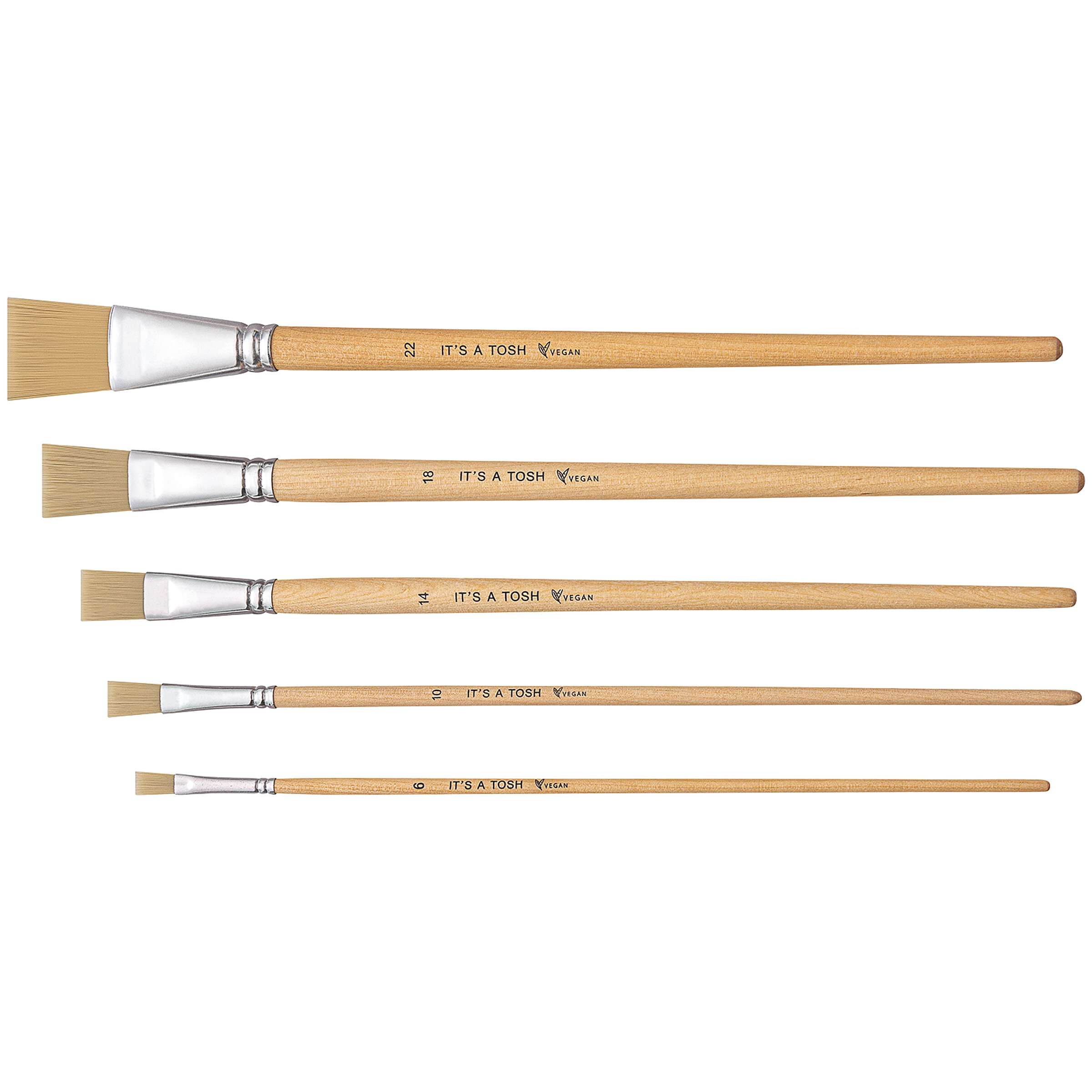 Flachpinsel für die Öl- und Acrylmalerei mit hochwertigem Besatz aus hellen Synthetikborsten, nahtloser Aluminiumzwinge, langer Naturholzstiel. Das Set beinhaltet folgende Größen: 6, 10, 14, 18 und 22. Vegan.
