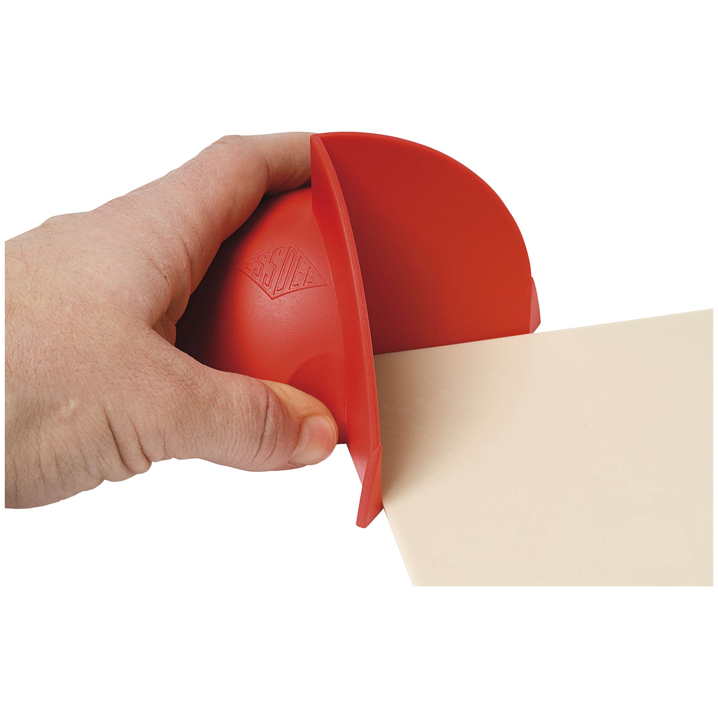 Der Halter aus rotem Kunststoff bietet sicheren Halt beim Bearbeiten der Druckplatten und schützt vor Verletzungen.