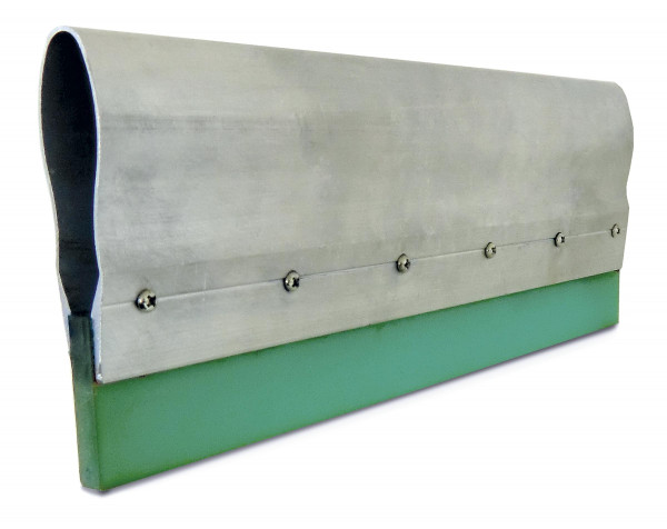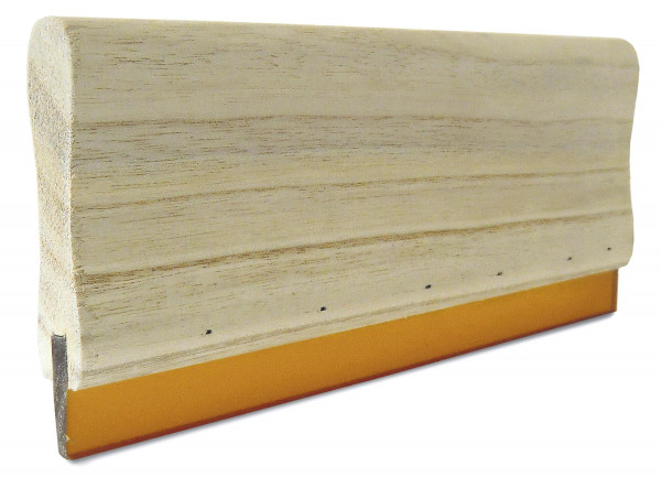 - Die Rakel, ein Werkzeug mit Gummilippe, dient zum gleichmäßigen Verteilen der Farbe.