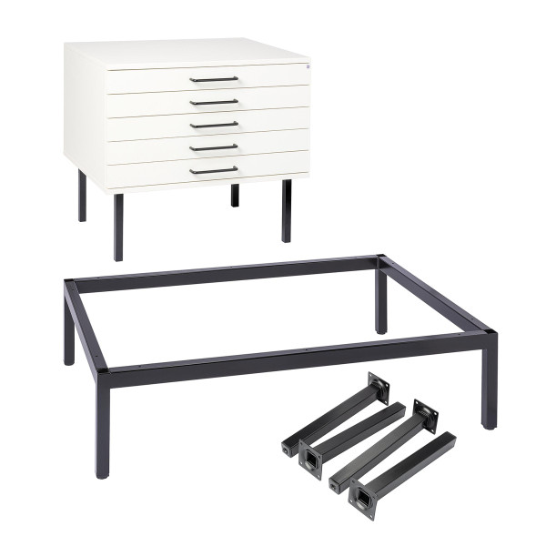 Mattschwarze (ähnl. RAL 9005), 26 cm hohe Stahlfüße für DIN A2-Schränke bzw. Stahlfußgestelle für DIN A1- und DIN A0-Schränke.