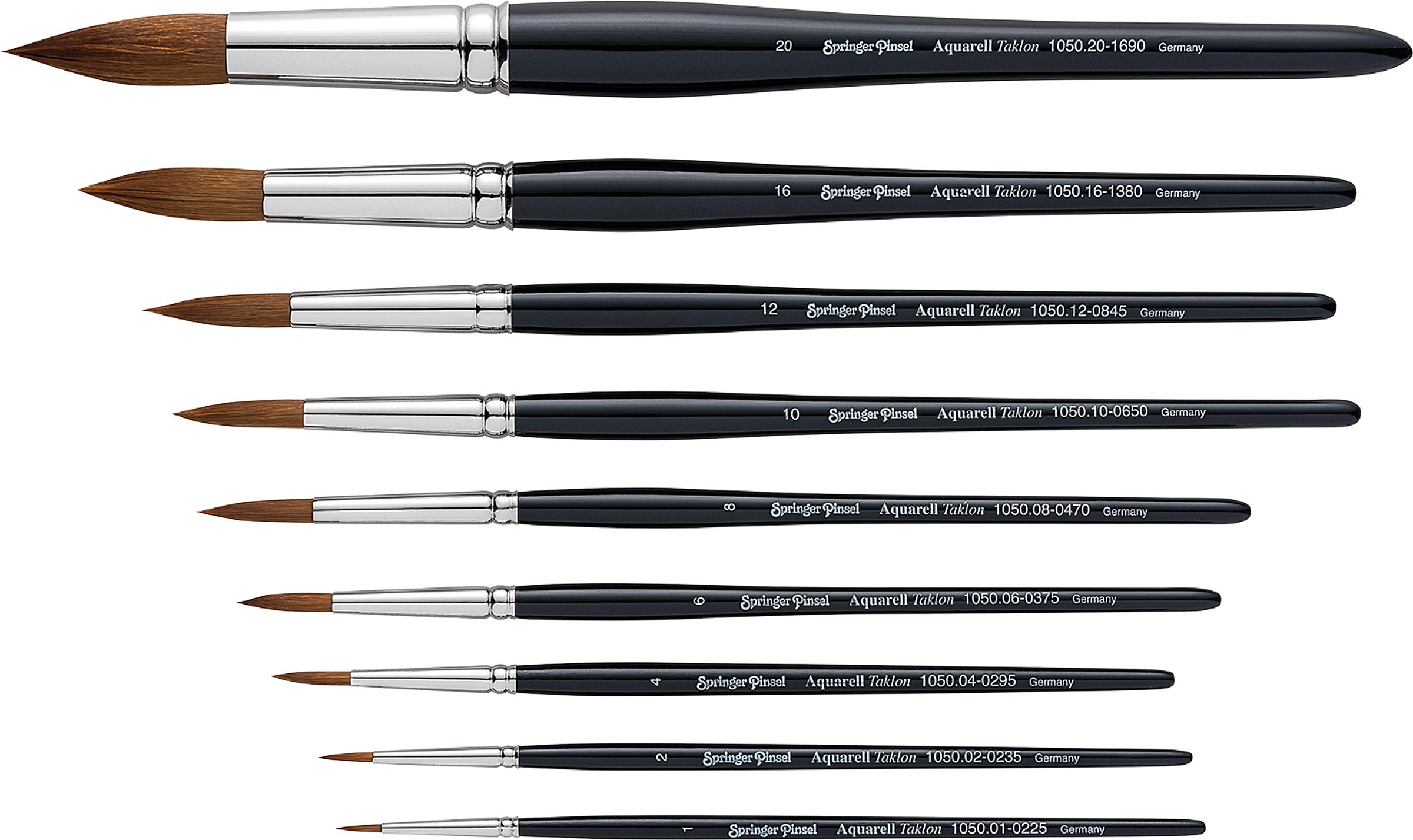 Aquarellpinsel mit synthetischem Taklon-Besatz. Die braune Faser hat eine hohe Farbaufnahmekapazität und ist ideal für die Arbeit mit sehr flüssiger Farbe geeignet. Beim Malen wird diese gleichmäßig abgegeben. Die exakt gearbeitete Spitze ist bei guter Pflege besonders formstabil. Mit Silberzwinge und schwarz lackiertem Holzstiel.