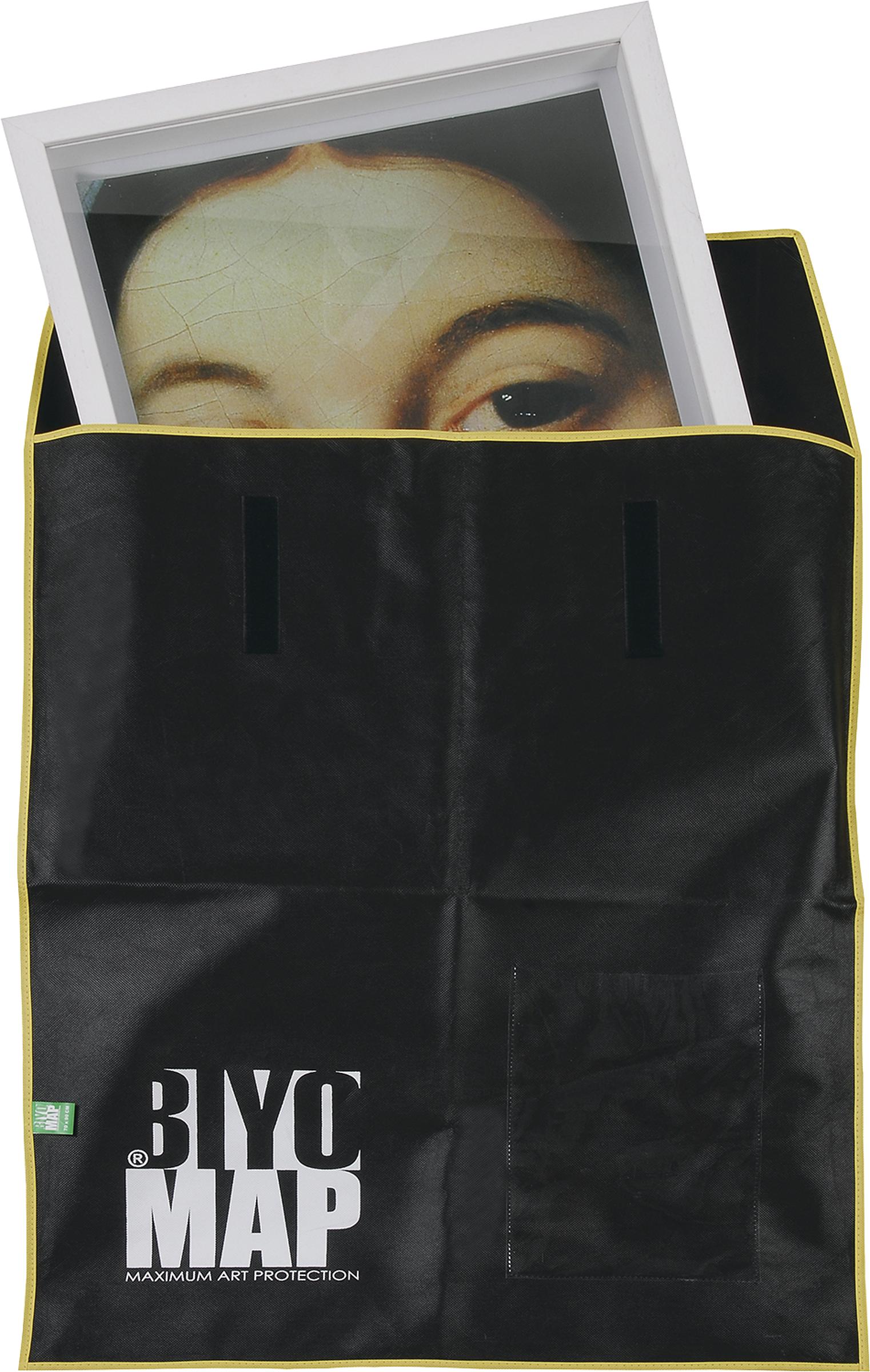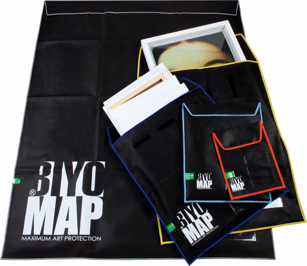 Maximaler Schutz in elegantem Design: Ob für den Transport oder zur sicheren Aufbewahrung von Bildern und Zeichnungen – Biyomap ist die umweltfreundliche Alternative zu herkömmlichen Verpackungsmaterialien. Auch bei einer längerfristigen Lagerung bieten die schwarzen Hüllen den idealen Schutz: Aus Recyclingmaterial hergestellt, sind sie säurefrei, wasserabweisend, aber trotzdem atmungsaktiv und kratzfest. Sie sind wiederverwendbar und lassen sich bei Nichtgebrauch platzsparend zusammenfalten. Biyomap-Hüllen sind leicht und bequem in der Handhabung. Durch die separat lieferbaren Tragegurte sind sie leicht zu transportieren, und durch den Klettverschluss schnell verschließbar. Sieben verschiedene Größen sind erhältlich – jede Größe ist durch einen farbig abgesetzten Rand markiert. Alle Hüllen sind außen mit transparentem Info-Fach im DIN A4-Format versehen – hier finden alle wichtigen Informationen zum Inhalt Platz. Nicht über längere Zeit Hitze oder UV-Strahlung aussetzen.