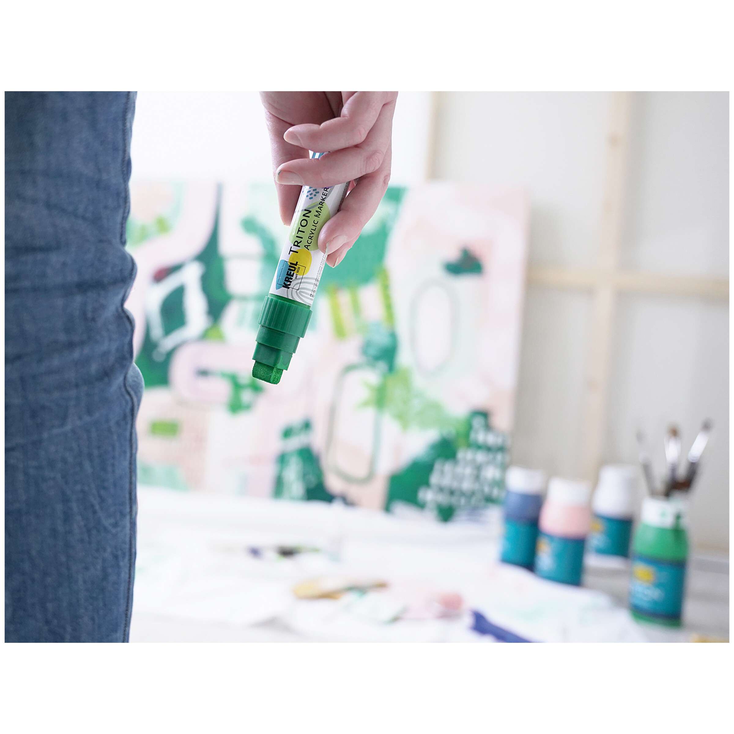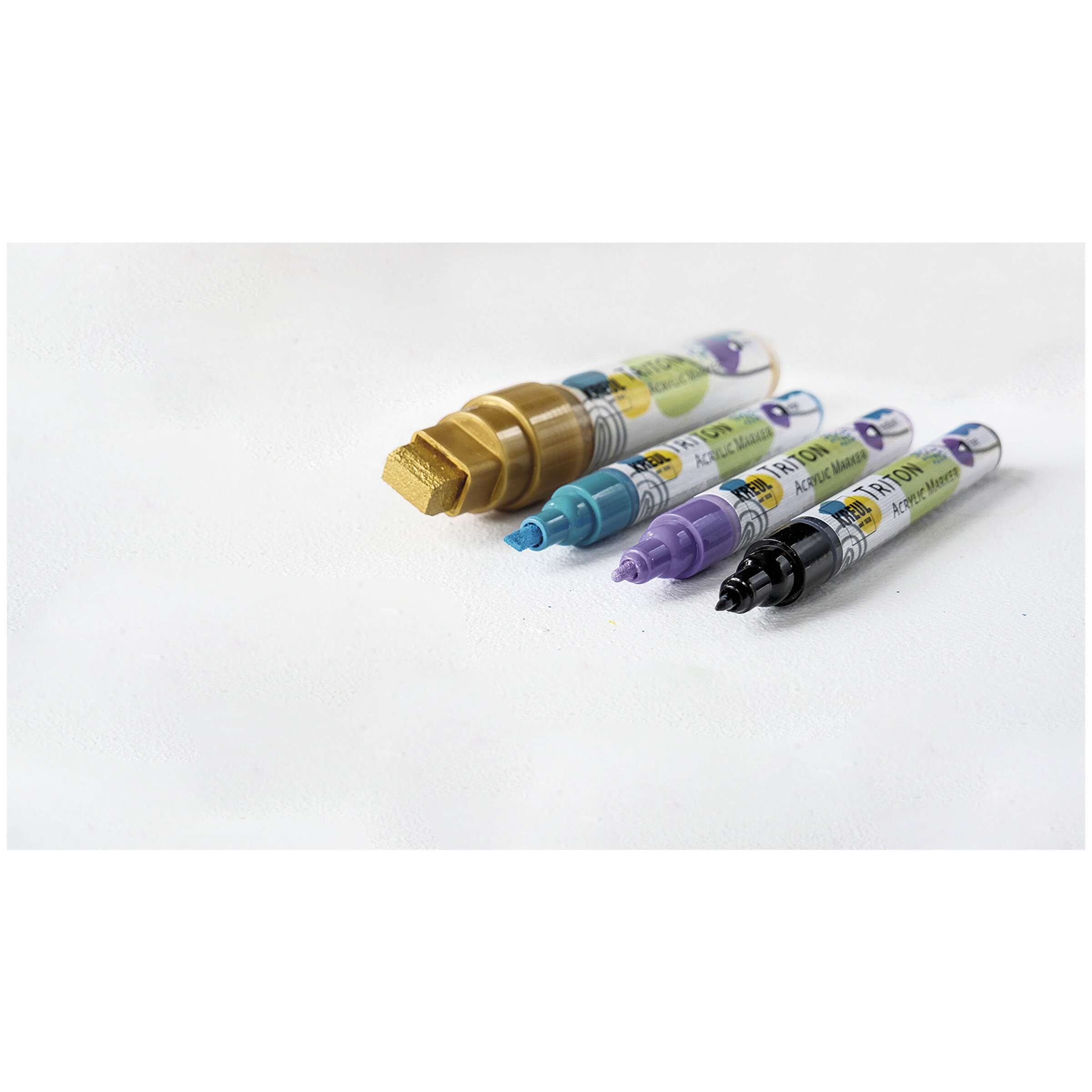 Marker mit brillanter, lichtechter Acryltinte auf Wasserbasis, geeignet zur Ausarbeitung von Details und flächigen Gestaltungen. Formstabile Spitzen in unterschiedlichen Strichstärken erlauben eine präzise Linienführung. Ein hochwertiges Ventilsystem gewährleistet darüber hinaus einen gleichmäßigen und exakten Farbfluss. Alle Farbtöne trocknen seidenmatt auf und sind koloristisch perfekt auf die Triton-Acrylfarbe abgestimmt.