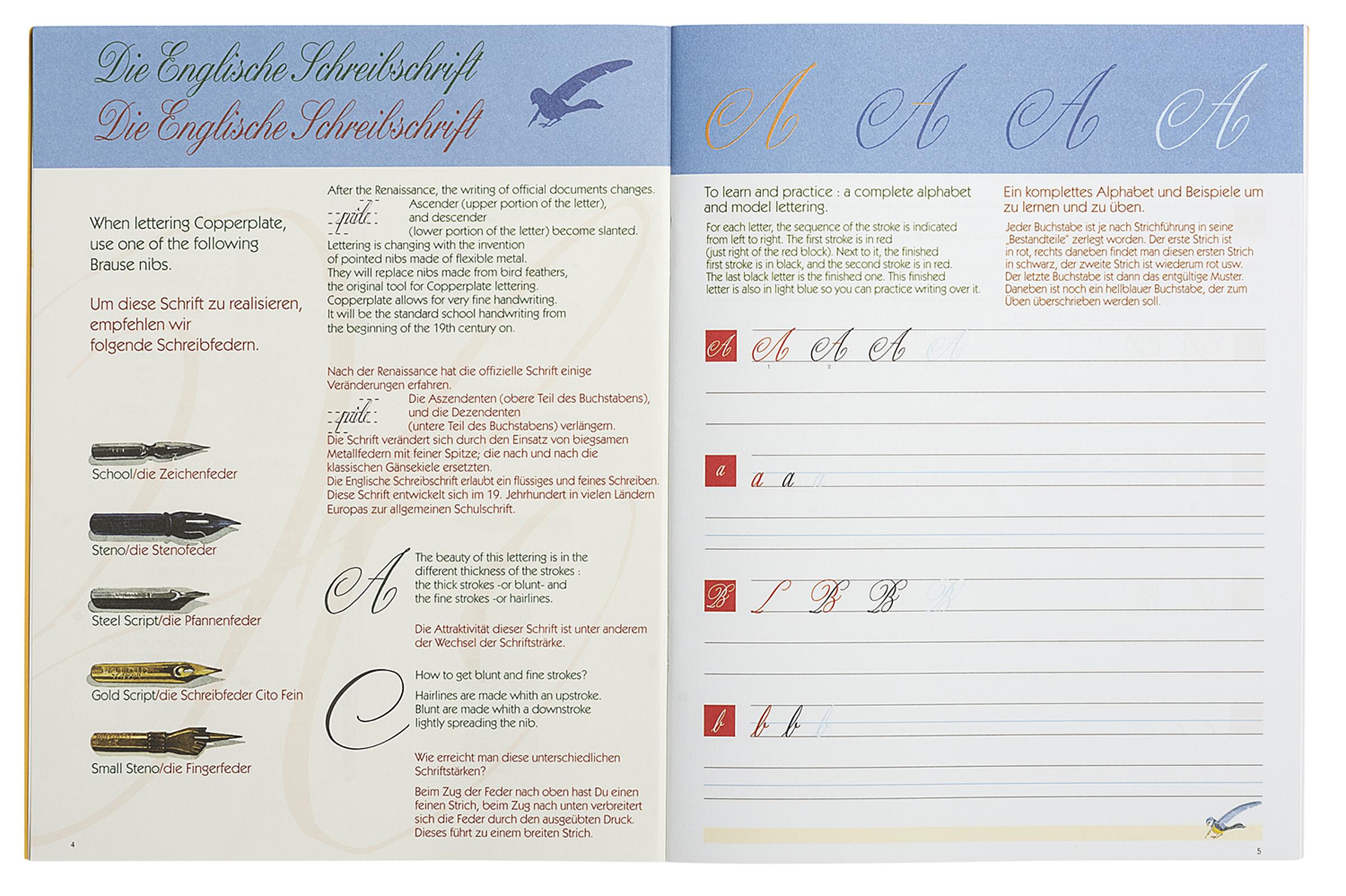 Für die ersten Schritte in der Schreibkunst. In diesem Heft werden der Gebrauch der Feder sowie die Schreibweise unterschiedlicher Schrifttypen (Englische Schreibschrift und runde Schrift) anschaulich erklärt. Auf den linierten Seiten für Schreibübungen wird die Strichführung der einzelnen Buchstaben aufgeschlüsselt. 40 Seiten inkl. 1 Set mit 16 Namensschildern.