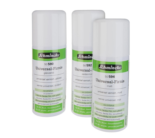 Kunstharzfirnis mit UV-Schutz für diverse Maltechniken, wie z. B. Öl-, Acryl- und Gouache-Malerei, aber auch für Inkjet-Ausdrucke, Kunstddrucke oder Fotos. Farblos, elastisch, nicht gilbend und alterungsbeständig sowie schnell trocknend. Erhältlich in glänzend, seidenmatt oder matt.