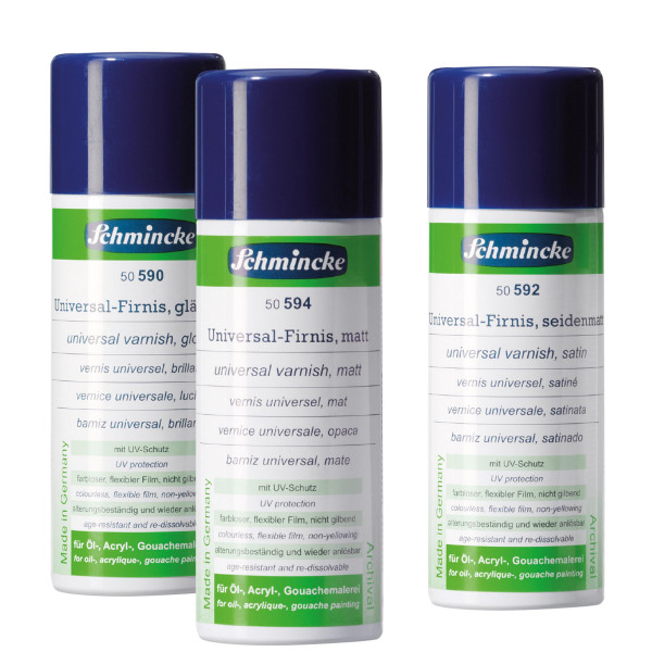 Nicht gilbender, alterungsbeständiger, farbloser Schlussfirnis. Schnell trocknend. Gibt elastischen und widerstandsfähigen Schutz für alle Schmincke Öl-, Acryl-, Gouache- und andere Künstlerfarben. Auch für Kunstdrucke, Inkjetausdrucke, Fotos und ähnliche Oberflächen im Innenbereich geeignet. Vortests werden immer empfohlen. Auftrag bei Ölbildern erst nach vollständigem Durchtrocknen der Farbschichten (frühestens nach 8–12 Monaten). Die trockene Firnisschicht bleibt löslich in Terpentinöl und Terpentinersatz. Vor Gebrauch kräftig schütteln und bei Zimmertemperatur aus 30–40 cm Abstand auf das senkrecht oder leicht geneigt stehende Objekt sprühen. Nach Trocknung Vorgang wiederholen, bis gewünschter Oberflächeneffekt erreicht ist. Verklebte Sprühköpfe mit Aceton reinigen. Benutzung ausschließlich gemäß Verwendungszweck. Nur leer entsorgen. Enthält: Propan/Butan, Acrylharz, UV-Absorber (Triazol- und Piperidylderivate - kann allergische Reaktionen hervorrufen), Testbenzin.