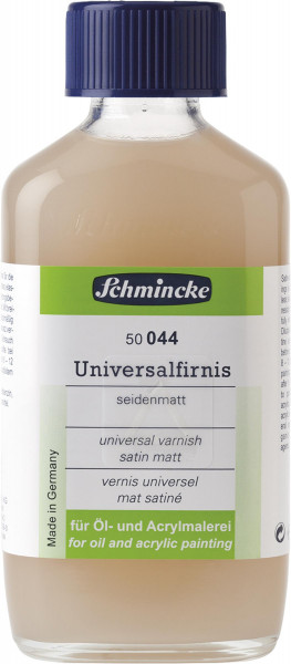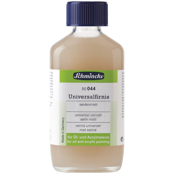 Seidenmatter, wachsfreier Harzfirnis für Öl- und Acrylbilder, der Glanzunterschiede der Farben weitgehend ausgleicht. Auftrag kann nach Durchtrocknung (frühestens nach 8–12 Monaten bei Ölfarbe) mit breitem, weichem Pinsel erfolgen. Mit Terpentinöl und -ersatz entfernbar. Vor Gebrauch gut schütteln. Enthält Acrylharz, Testbenzin, anorganisches Mattierungsmittel.