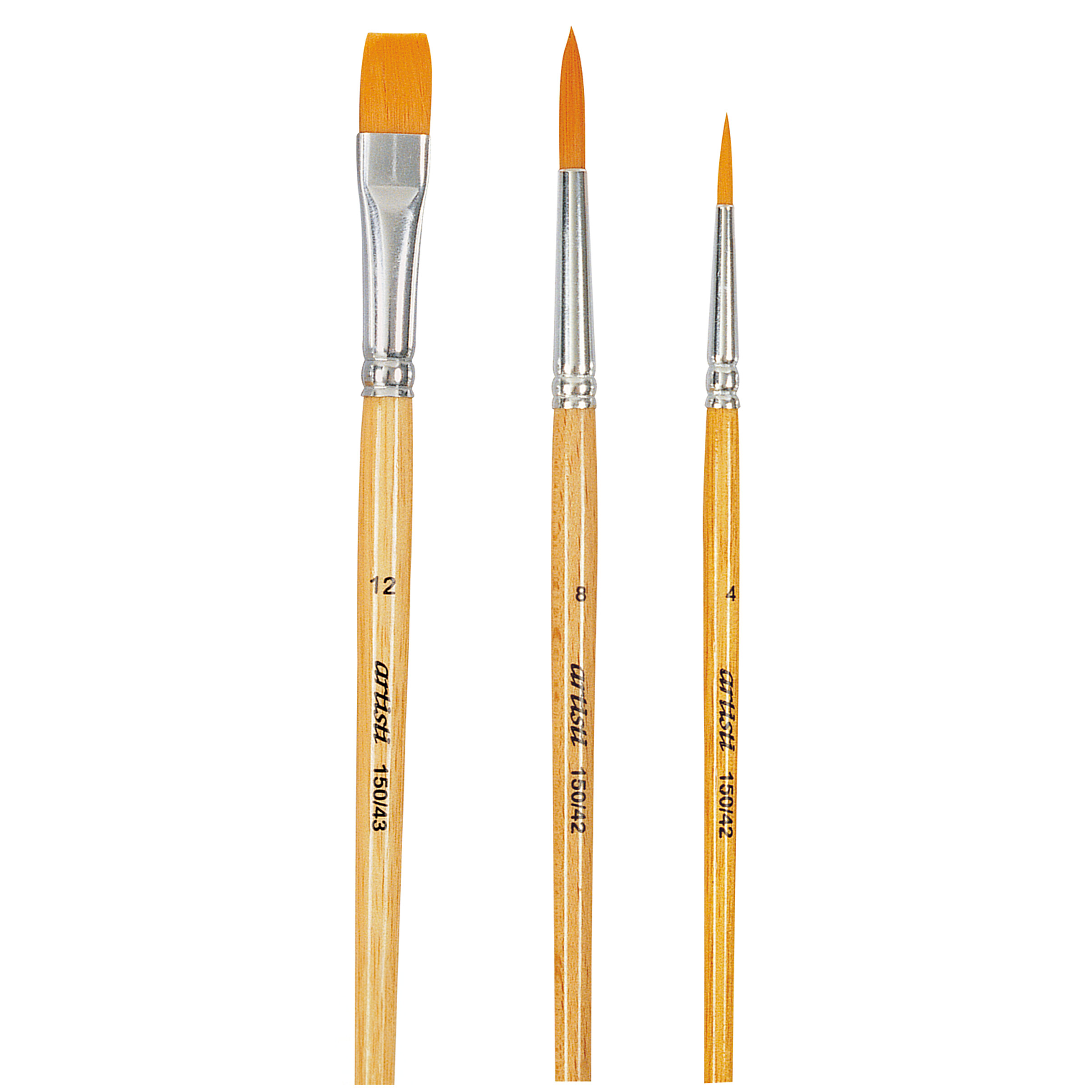 Pinsel mit goldfarbenem Synthetik¬haar¬besatz. Kurzer, naturlackierter Stiel mit nahtloser Aluzwinge. Geeignet für Arbeiten mit Aquarellfarbe, Gouache, Acryl- und Ölmalfarbe. Das Set beinhaltet zwei runde Pinsel der Serie 150/42, Größe 4 und 8 sowie einen flachen Pinsel der Serie 150/43, Größe 12.