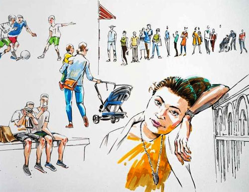 In diesem kurzweiligen Kurs geht es um die groben Formen, typischen Bewegungsabläufe, perspektivische Darstellung von Menschengruppen und teilweise sogar um das Sketchen von Gesichtern.