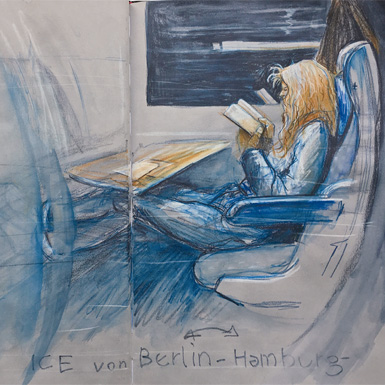 Aquarellstifte sind für viele Zeichner eine große Herausforderung, da die wasserlöslichen Farbstifte beim Anfeuchten schnell entweder sehr bunt werden oder zu einem graubraunen Brei zusammenlaufen. Für den Urban Sketcher Jens Hübner sind es bevorzugte Zeichenmaterialien, mit denen er schnell und mit wenigen Strichen im Winter in der U-Bahn, im Café oder Museum Architektur und Menschen im Skizzenbuch festhält, ohne auf das lästige Trocknen der Aquarellfarben warten zu müssen.