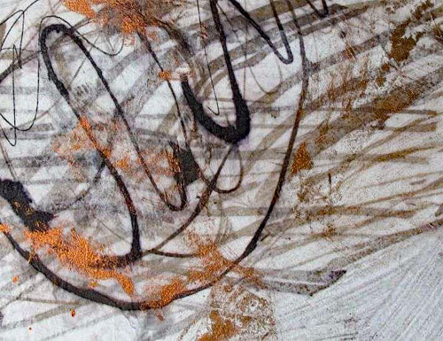 Zu Beginn gestalten Sie einzelne Elemente – Linien, Formen, Texturen – auf Seidenpapier, das anschließend in Kombination mit Gouache auf die Leinwand übertragen wird. Dabei entstehen durch das Übereinanderschichten und Kombinieren einzigartige Werke mit Tiefe, Dynamik und Ausdruckskraft.