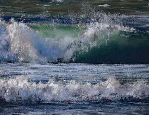 Wellen gehören zu den faszinierendsten und zugleich herausforderndsten Motiven in der Malerei. Je nach Lichteinfall können Wellen ganz unterschiedlich wirken, mal transparent durchscheinend, mal massiv und dynamisch. Mit den Softpastellen lassen sich Bewegung und Tiefe von Wellen besonders gut darstellen.