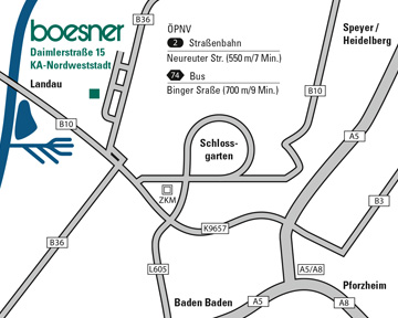 A5 aus Richtung Basel: Von der Ausfahrt Karlsruhe-Süd (48) 400 m weiter an der Kreuzung links auf die B3/L605 abbiegen. Bei der Ausfahrt Landau/Neureut auf B10 abfahren. Bei der Ausfahrt B36 Richtung Mannheim/Knielingen abfahren. Auf B36/Neureuter Str. bleiben. Nach 1,7 km fahren Sie an der Ampel bei Burger King links in die Boschstr. und biegen gleich die nächste Straße wieder links in die Daimlerstr. ab. Nach 140 m am boesner-Schild in den Hof abbiegen.