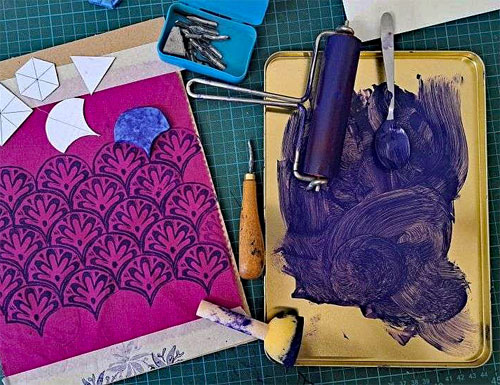 In diesem Kurs gestalten Sie einzigartige Muster und Motive und bringen diese mit handgeschnitzten Stempeln auf Stoff.