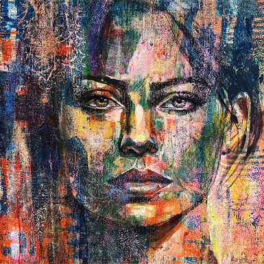 Beginnend mit dem Hintergrund, den Sie mithilfe der Spachteltechnik gestalten, zeichnen und malen Sie dann darüber das Porträt. Mithilfe von Collagen, Schablonen und diversen Effekt-Mitteln werden Sie das Porträt schichtweise aufbauen.