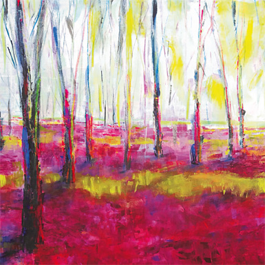 Waldbilder sind dabei besonders spannend. Dabei geht es um die wesentliche Stimmung, Licht, Schatten, und den Rhythmus von verschiedenen Senkrechten (Stämme) und den Diagonalen (Schattenwurf). Durch stärkere Strukturen im Vordergrund und weiche Farbflächen im Hintergrund wird Tiefe erzeugt.