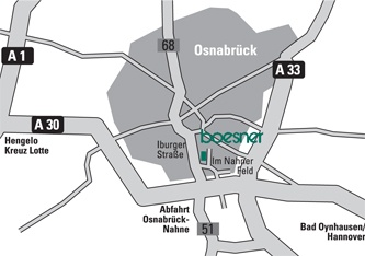 Die boesner-Filiale liegt unmittelbar an der Autobahn A 30 (Bad-Oeynhausen-Hengelo). Sie nehmen die Abfahrt Osnabrück-Nahne (bitte genau diese Abfahrt) und folgen der Iburger Straße ca. 400 m in Richtung Osnabrück-Zentrum bis zur ersten Ampel. Von hier aus sehen Sie bereits auf der rechten Seite die boesner-Filiale „Im Nahner Feld 1”.