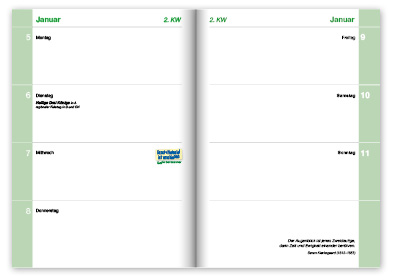 Das Kalendarium bietet mit einer Doppelseite pro Woche genügend Platz für Notizen und für die Terminplanung.