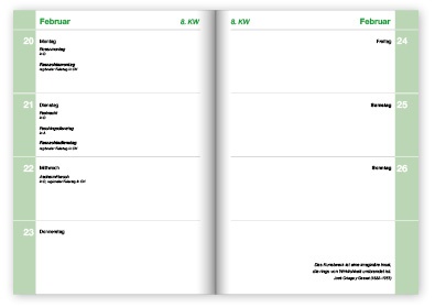 Das Kalendarium bietet mit einer Doppelseite pro Woche genügend Platz für Notizen und für die Terminplanung.