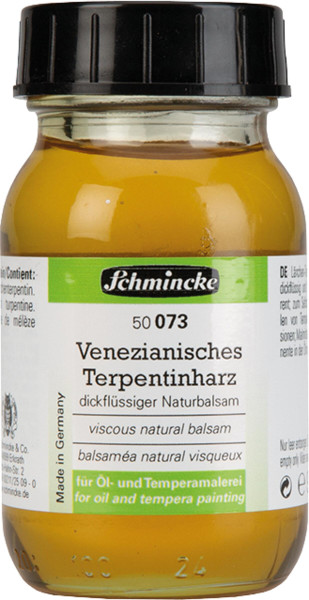 Naturbalsam/Terpentin aus Lärchen. Dickflüssig, transparent. Zum Selbstherstellen von Tempera-Emulsionen. Malmittelkomponente für die Ölmalerei. Löslich in Terpentinöl und Terpentinersatz.