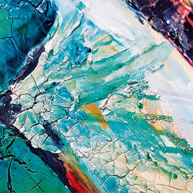 Herkömmliche Acrylfarben mischen sich mit Spachtelmassen, Effektfarben und Epoxidharzen (Resin). Die so erzeugten Effekte erweitern die Grenzen der traditionellen Malerei.