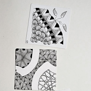 Zentangle® ist eine Zeichenmethode, bei der mit wenigen Strichen erstaunliche Muster mit 3D-Effekt entstehen. Die Methode ist einfach zu erlernen und benötigt wenig Material. Auf quadratischen, kleinen Karten werden die Muster mit einem Fineliner gezeichnet. Striche und Schwünge wiederholen sich.