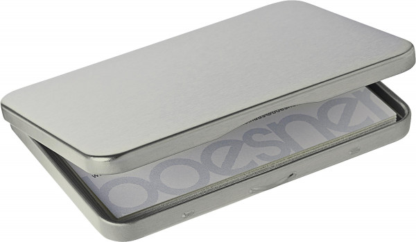 Stahlblech, seidenmatt verzinnt und transparent lackiert. Passend für alle gängigen Visitenkartenformate.