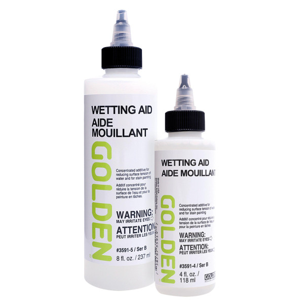 Der Wetting Aid ist ein konzentriertes Additiv, das die Oberflächenspannung des Wassers in einer Acrylemulsion verringert, wodurch die Fließgeschwindigkeit der Farbe erhöht wird. Es eignet sich besonders gut für Farbwaschungen auf roher Leinwand (engl. ‚staining‘). Der Wetting Aid enthält keine Bindemittel und wird am besten mit Wasser verdünnt aufgetragen.
