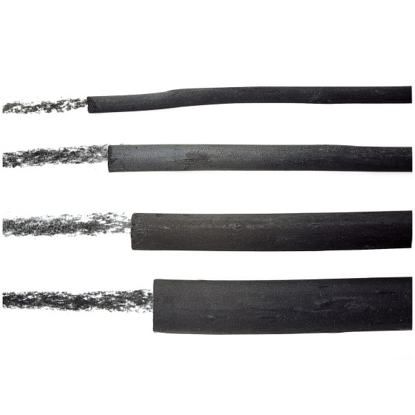 Feinste, weiche, englische Naturkohle, tiefschwarz, beste Qualität für höchste künstlerische Ansprüche. Ausschließlich weiches, harzfreies Holz. Verkohlt unter Luftabschluss. Länge: ca. 14 cm.