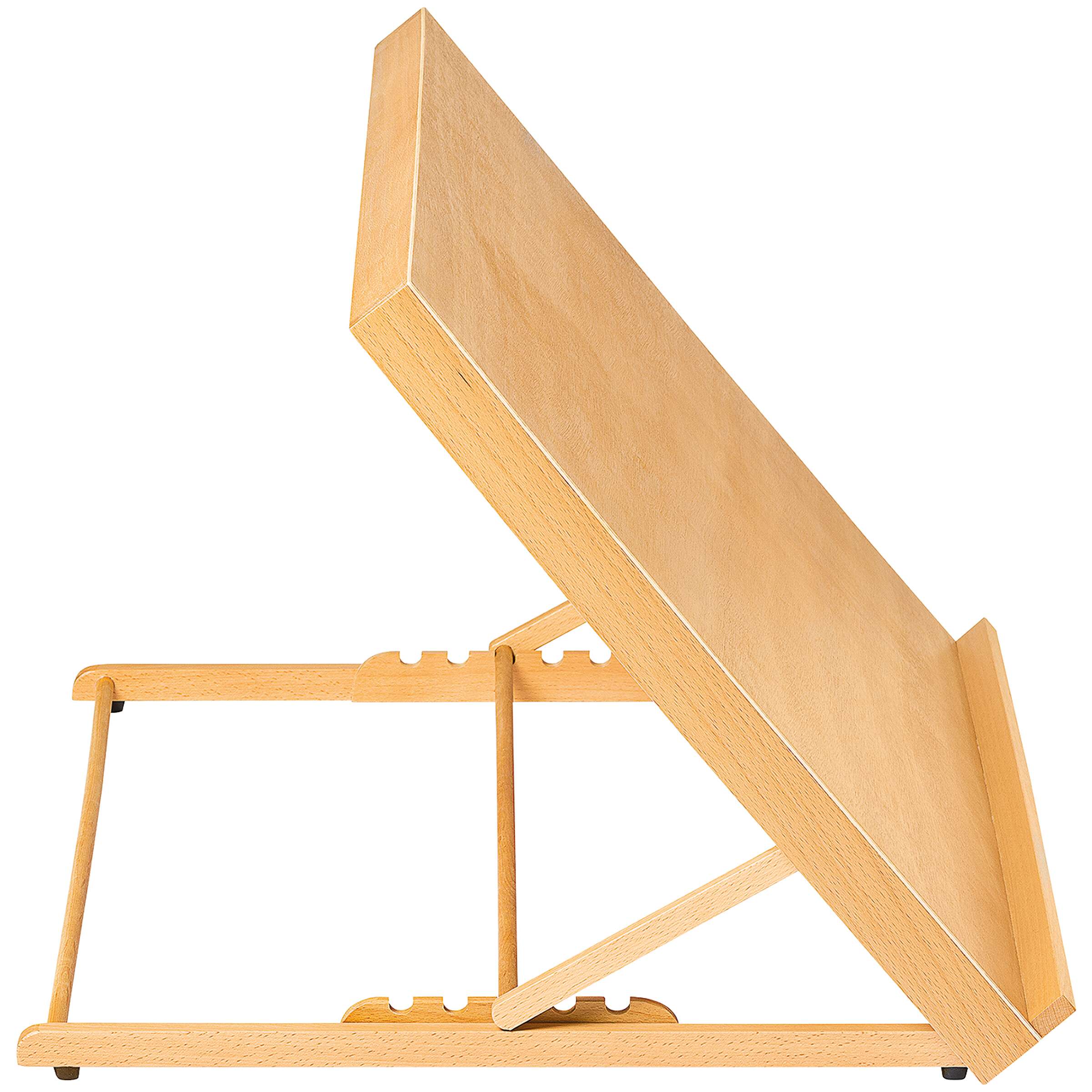 Das neigungsverstellbare Zeichenbrett mit einem Rahmen aus massivem Buchenholz bietet eine stabile Grundlage für die zeichnerische Arbeit. Die Arbeitsfläche ist in 5 (bei der kleineren Ausführung in 4) Neigungswinkeln verstellbar und erlaubt eine vielfache senkrechte oder horizontale Nutzung, wahlweise auch als Tisch-Staffelei für andere Maltechniken. Papier, Karton oder Keilrahmen finden auf der Auflagefläche mit Ablage sicheren Halt, für einen festen Stand sorgen rutschfeste Füße.
